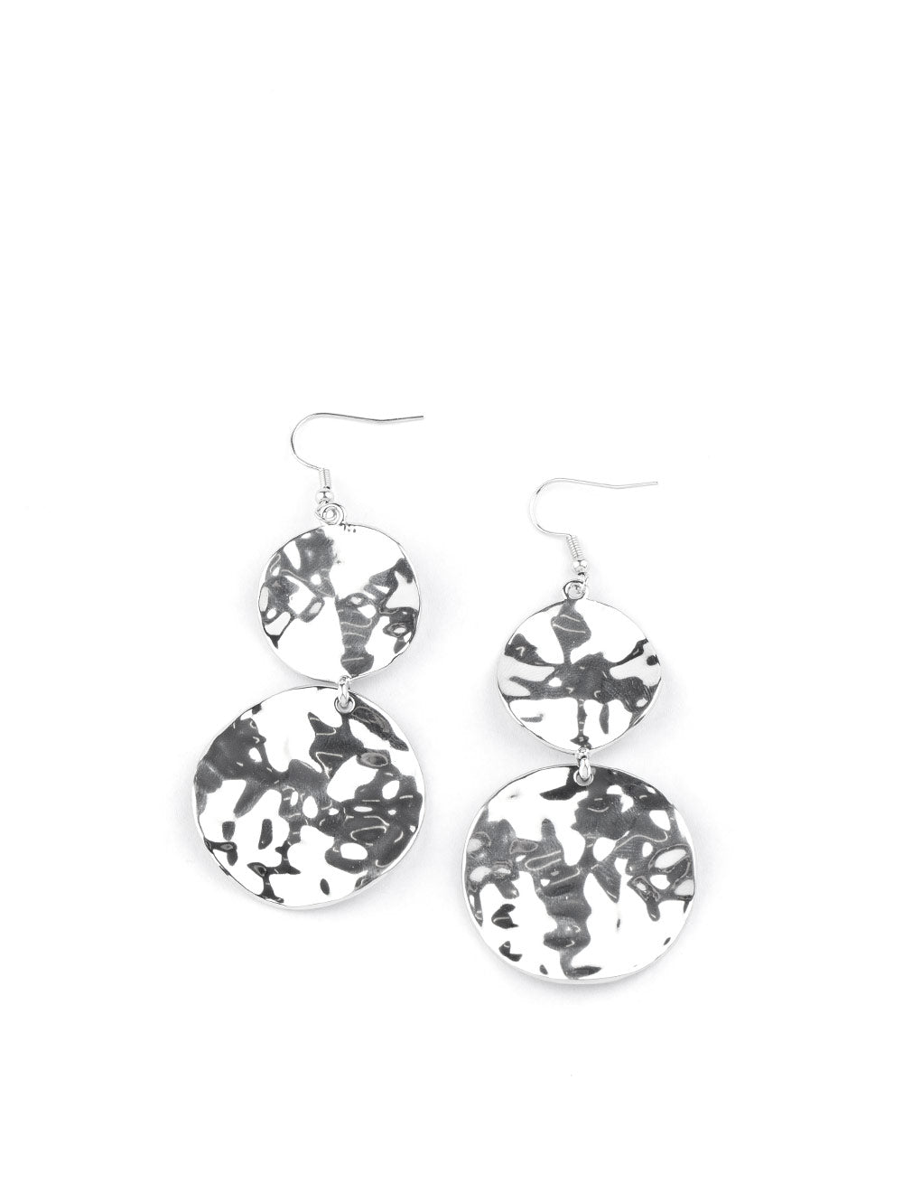 Delicately hammered in rippling textures, a pair of imperfect silver discs link into a dramatic industrial lure. Earring attaches to a standard fishhook fitting.