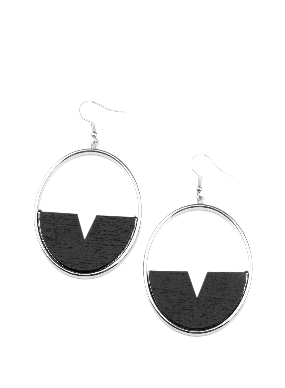 Featuring a triangular cut, a crescent shaped black wooden frame is fitted in place along the bottom of a shiny silver hoop, creating a retro lure. Earring attaches to a standard fishhook fitting.