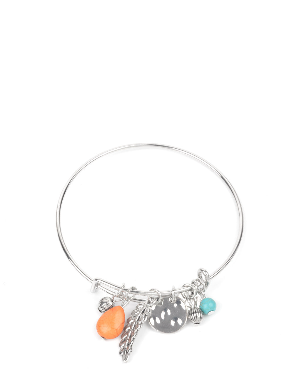 Featuring a shimmery silver feather charm, ornate silver beads and earthy stone beads glide along the fitted center of a dainty silver bangle for a whimsically charming look.