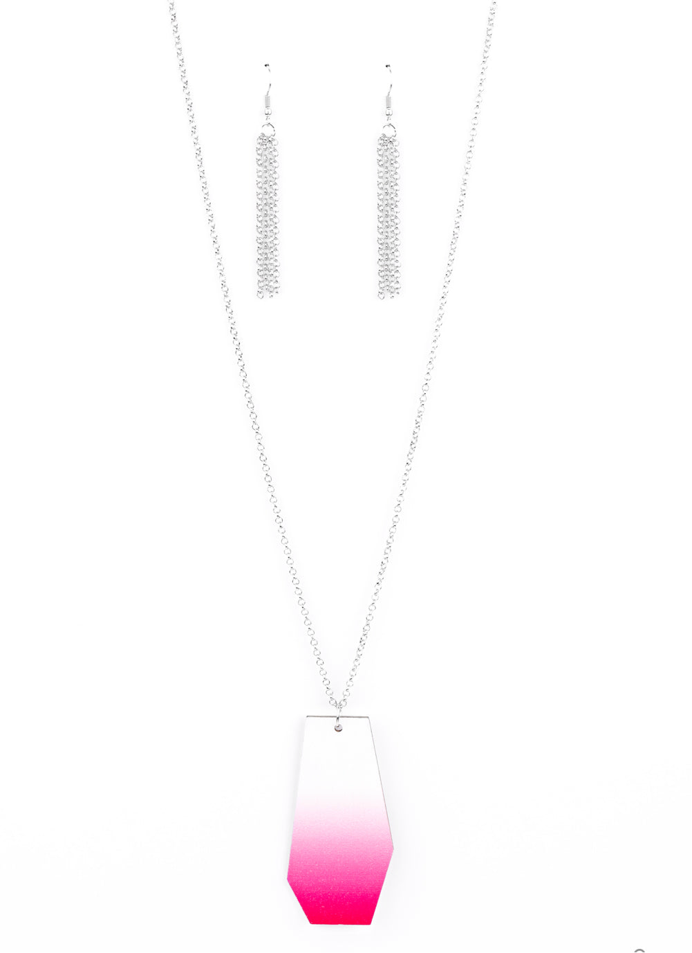An abstract wooden piece gradually fades from white to pink, creating a colorful ombre inspired pendant at the bottom of a silver chain. Features an adjustable clasp closure.