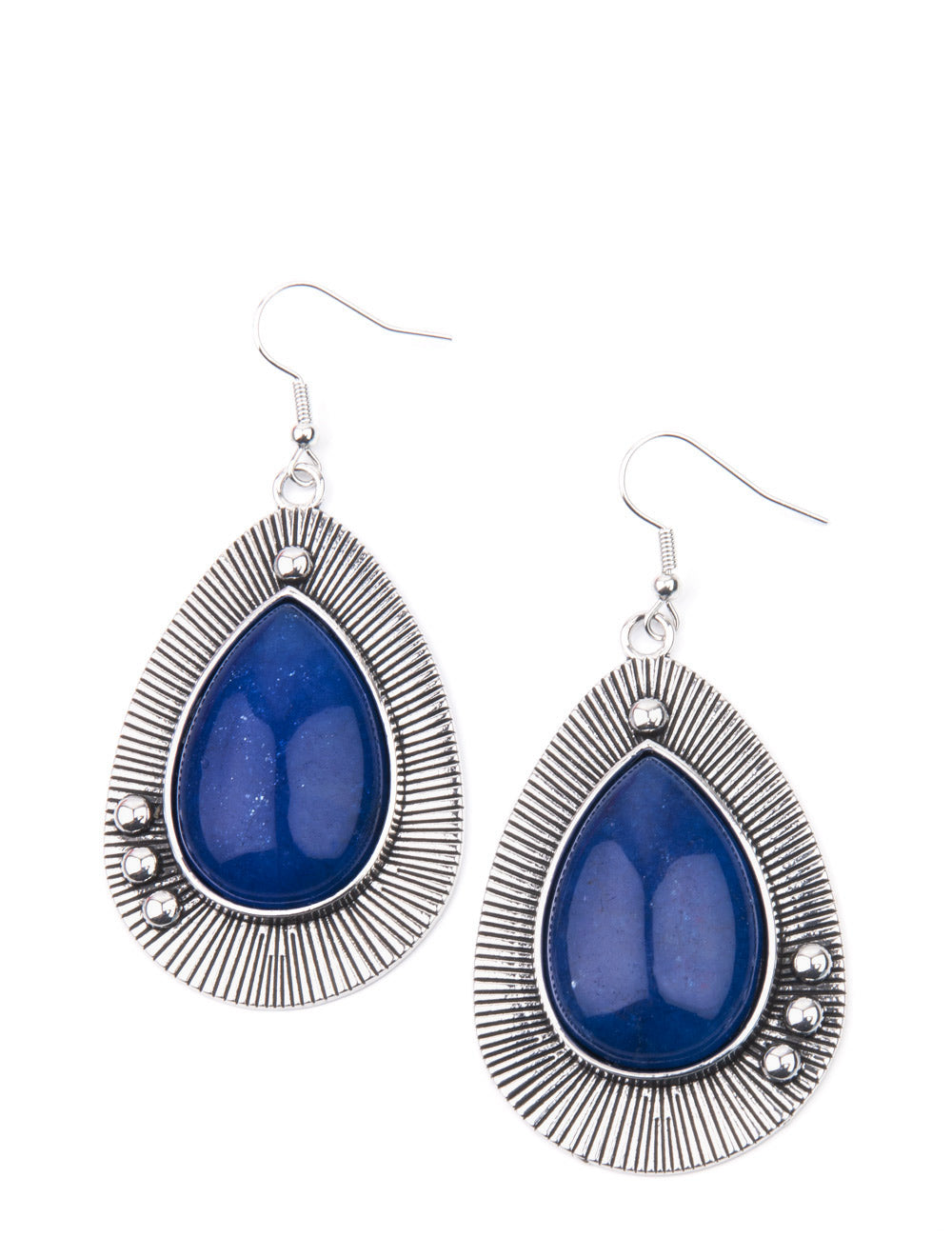 Chiseled into a tranquil teardrop, a shimmery French Blue stone bead is pressed into the center of a rustically studded silver frame radiating with antiqued detail for a southwestern flair. Earring attaches to a standard fishhook fitting.